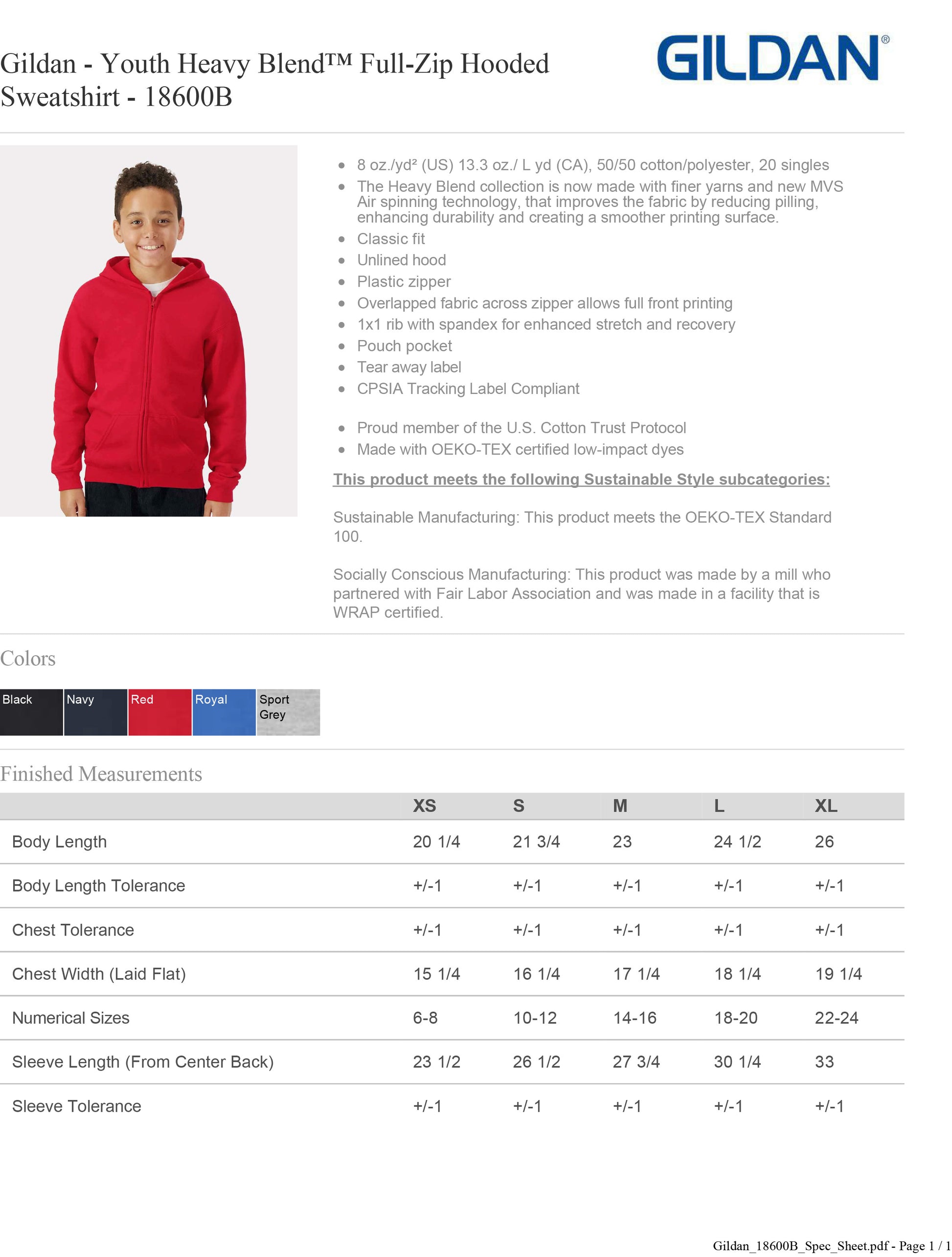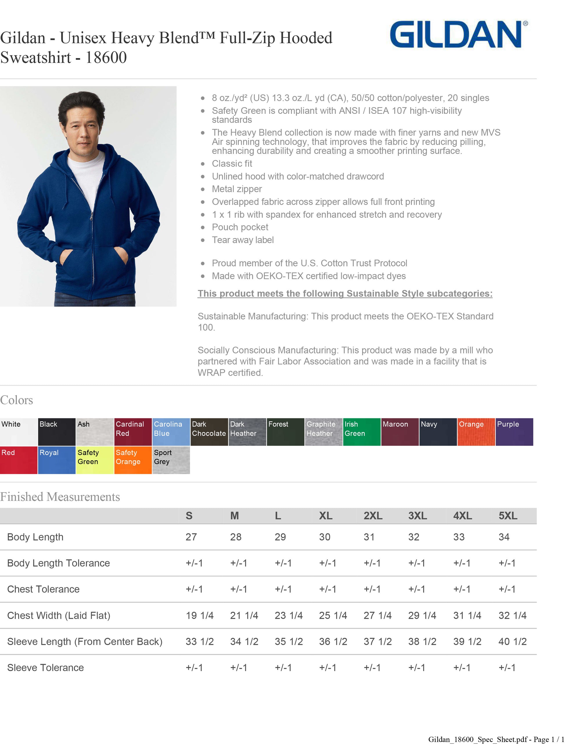 All of our items feature a spec sheet showing fabric info, available colors as well as a sizing char