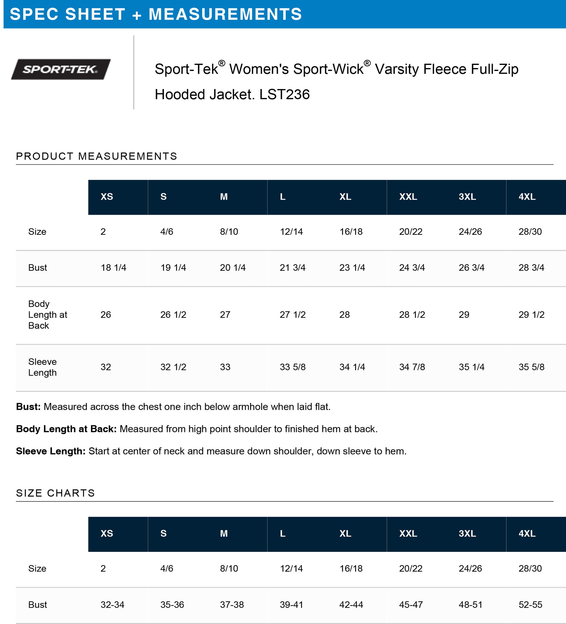 Images of spec sheets provided for apparel and sizing information. Please select size/color/print options from pull down menus